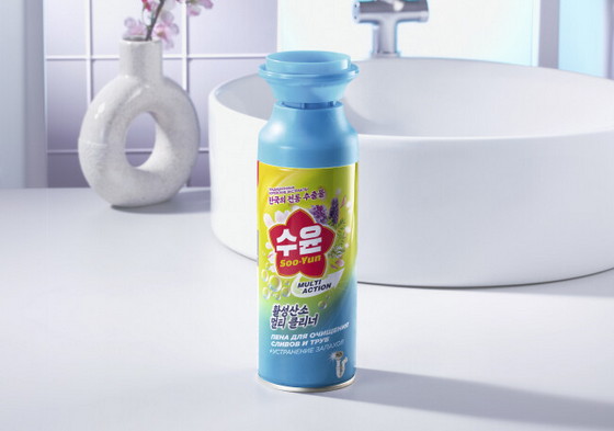 Активная пена для профилактического очищения сливов и труб Soo-Yun эффективно удаляет жир, мельчайшие остатки пищи, неприятные запахи и затхлость;